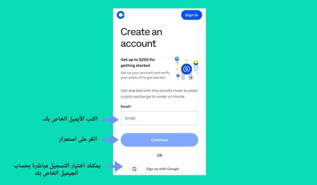 فتح حساب في Coinbase بالصور انظر بدقة للصورة الآتية:
