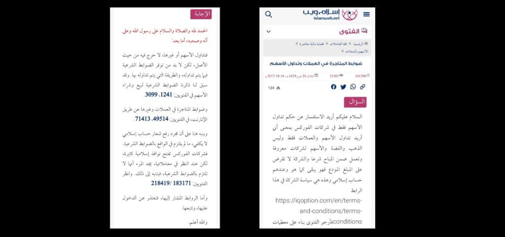 أرسل أحد قراء الموقع الشهير إسلام ويب استفسار هام إلى شيوخ الموقع أتى فيه أنه قام بفتح حساب إسلامي في منصة شهيرة، وأنه يعمل فيه وفق ضوابط الشريعة حتى يكون مكسبه حلالًا طيبًا، وأنه يتداول في مجال الأسهم والعملات الرقمية ويبتعد عن الفضة والذهب، فهل ربحه يقبله الدين أم أنه حرام لا قدر الله.