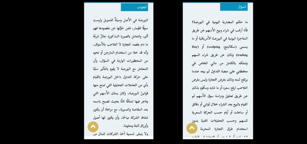 أما فيما يخص المضاربة اليومية في البورصة فهو موضوع آخر سأل عنه أحد القراء حيث ذكر  أنه يقوم بشراء الأسهم بماله الخاص، ثم يحتفظ بها في محفظته الإلكترونية ليقوم ببيعها بعد زمن قصير عندما يرتفع سعرها، وأنه يلجأ إلى تحليل سوق الأسهم ويدرسه جيدًا قبل اتخاذ قرار البيع أو الشراء، وأنه يبتعد تمامًا عن المضاربة بنظام المارجن، ولا يستثمر في العقود الآجلة فهل ما يفعله في مجال التداول حلال ام حرام بالكيفية سابقة الذكر؟